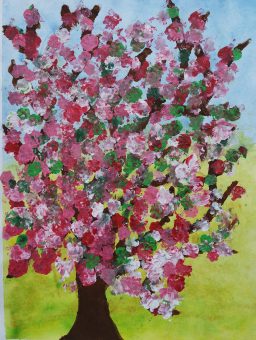 Gezeigt werden 2 großformatige Bilder und viele weitere Gemälde, die blühende Frühlingsbäume und - blumen darstellen.