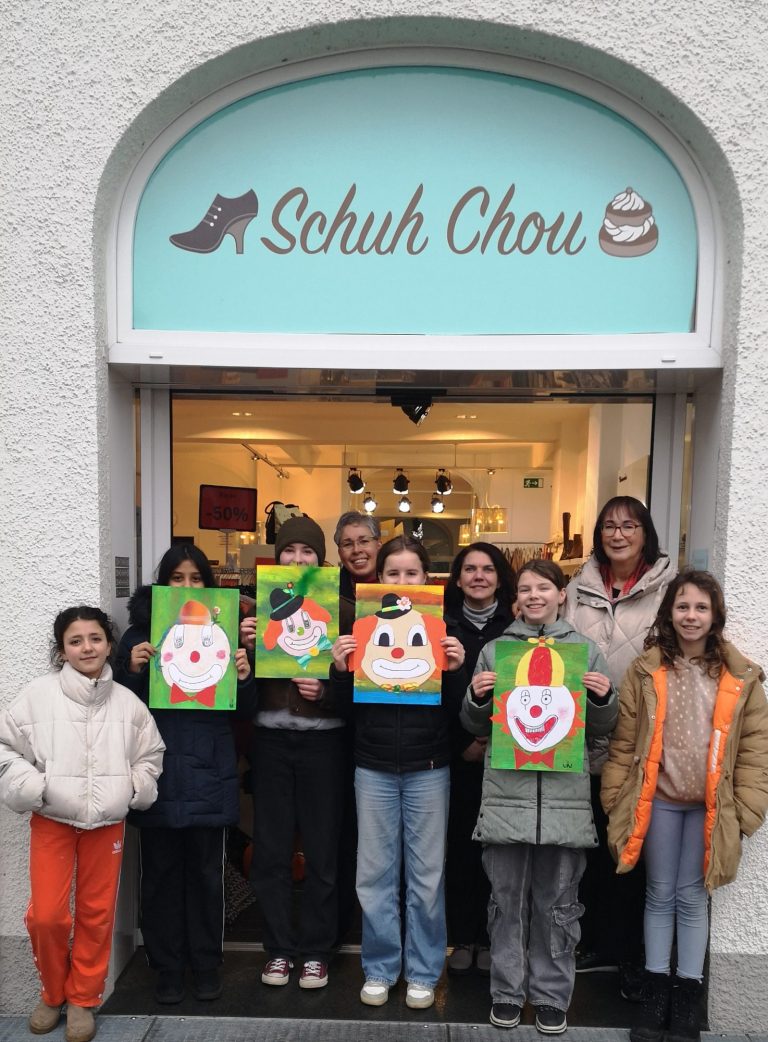 Bunte Clowns schmücken das Schaufenster im Schuh Chou auf dem Rathausplatz. Gestaltet wurden die Bilder von den Jugendlichen der Kunstwerkstatt des Förderkreises für Kinder, Kunst und Kultur.