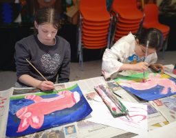 Die Leiterin der Kunstwerkstatt Andrea Perthel erklärte den Kindern den Begriff Finissage und erzählte, wie sich die Gäste des Altstadtcafés für ihre Gemälde begeistert haben.